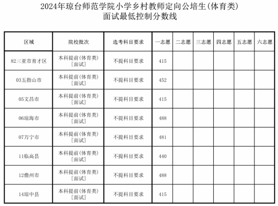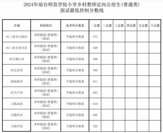 已取得参加我校本科提前批招生面试资格的考生均可参加面试,面试名单详见海南省考试局发布的《2024年琼台师范学院乡村教师定向公培生计划面试考生名单》(http://ea.hainan.gov.cn/ywdt/ptgkyjszsb/202406/t20240630_3689193.html)。未取得面试资格的考生不能参加面试。各市县定向公培生面试最低控制分数线详见附件1及附件2。